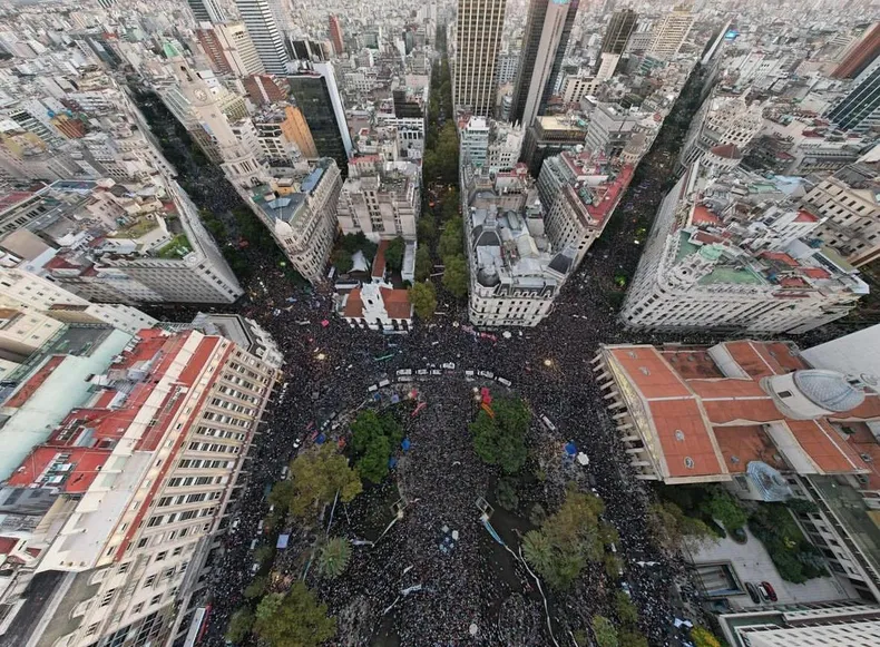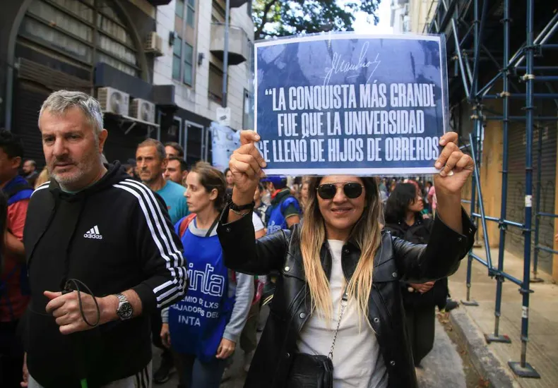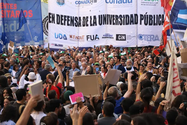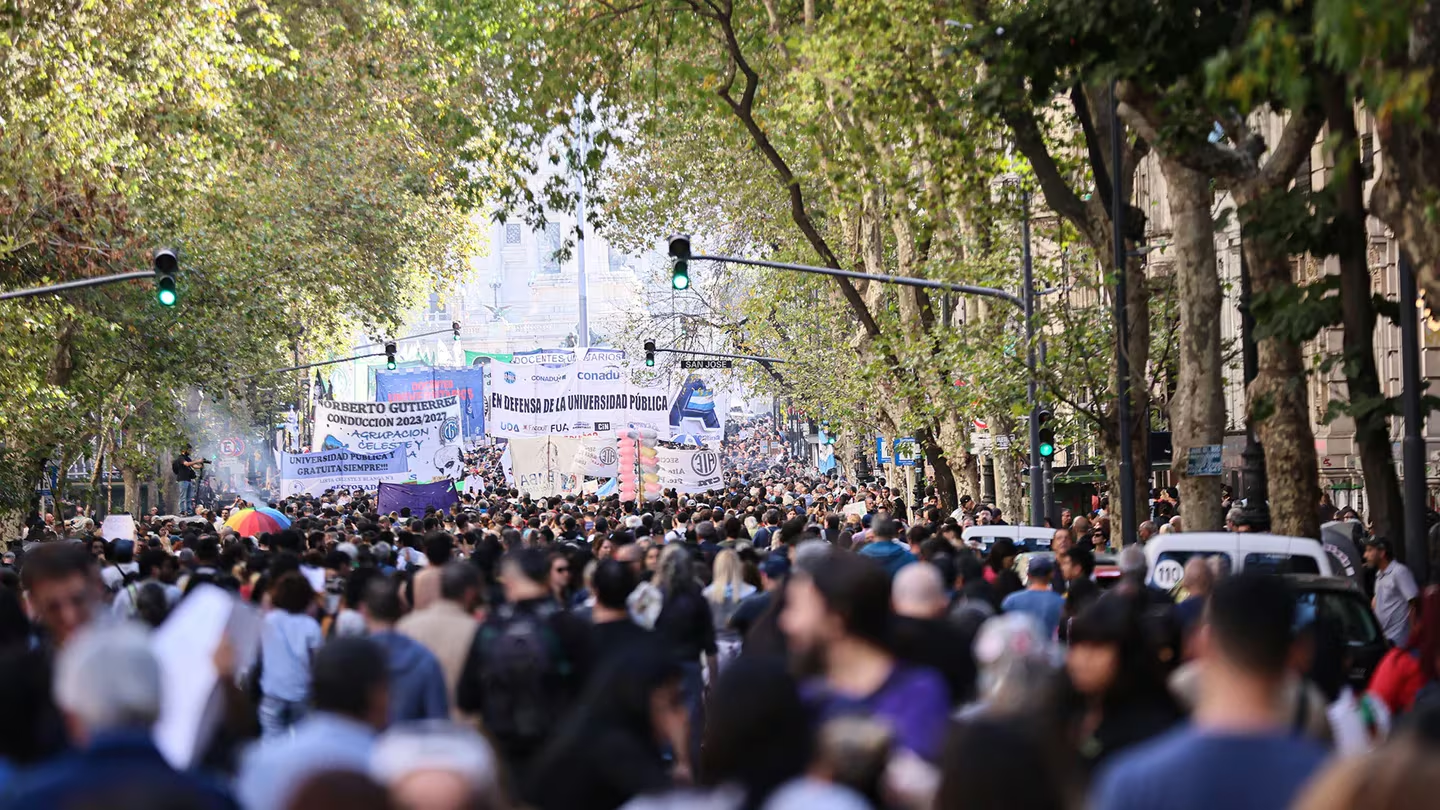 Miles de estudiantes, docentes y no docentes y graduados de la universidad pública se concentraron y marcharon hacia la Plaza de Mayo en defensa de la educación pública y gratuita y contra el ajuste del gobierno del presidente Javier Milei en el presupuesto universitario.