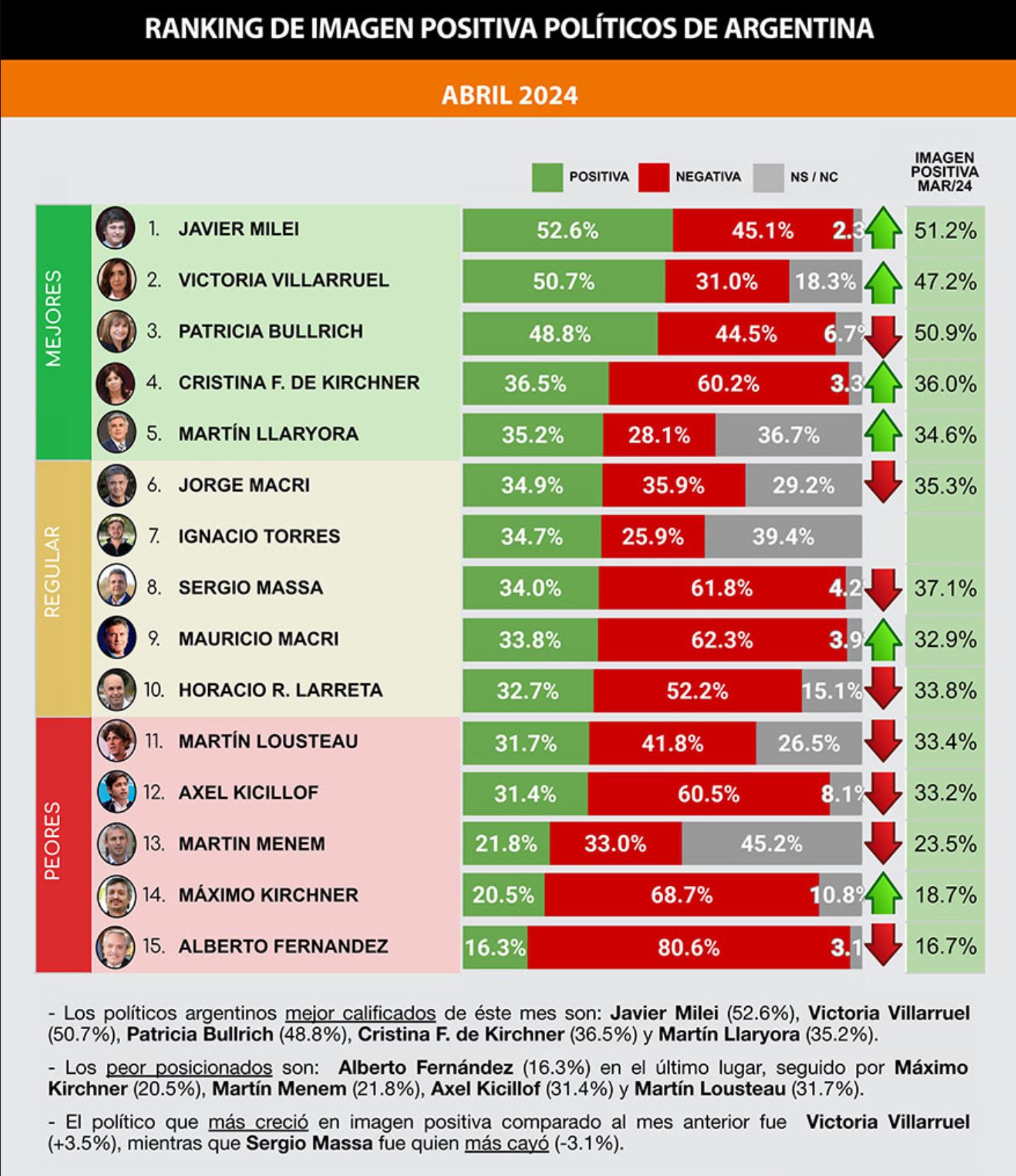 En Abril de 2024, los políticos argentinos mejor calificados de ese mes fueron: Javier Milei (52.6%), Victoria Villarruel (50.7%), Patricia Bullrich (48.8%), Cristina F. de Kirchner (36.5%) y Martín Llaryora (35.2%).